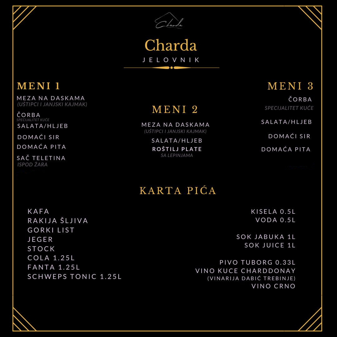 - Na meniju: tradicionalna meza, domaći uštipci, čorbe, jela ispod sača, teletina pod žarom, domaće pite i svježe povrće iz vlastite organske proizvodnje.